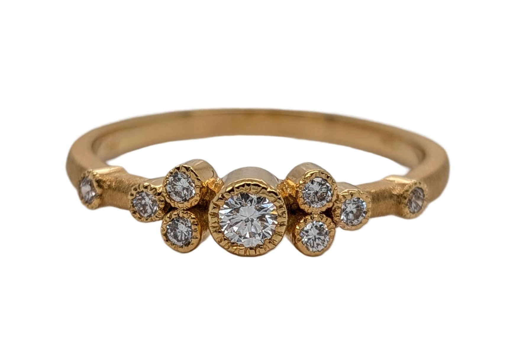 14K yellow gold ring featuring round diamonds weighing 0.19ctw.