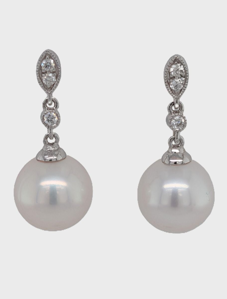 14K white gold earrings with 6 brilliant cut round diamonds weighing 0.11ctw and 2 fresh water pearls measuring 9-10mm.