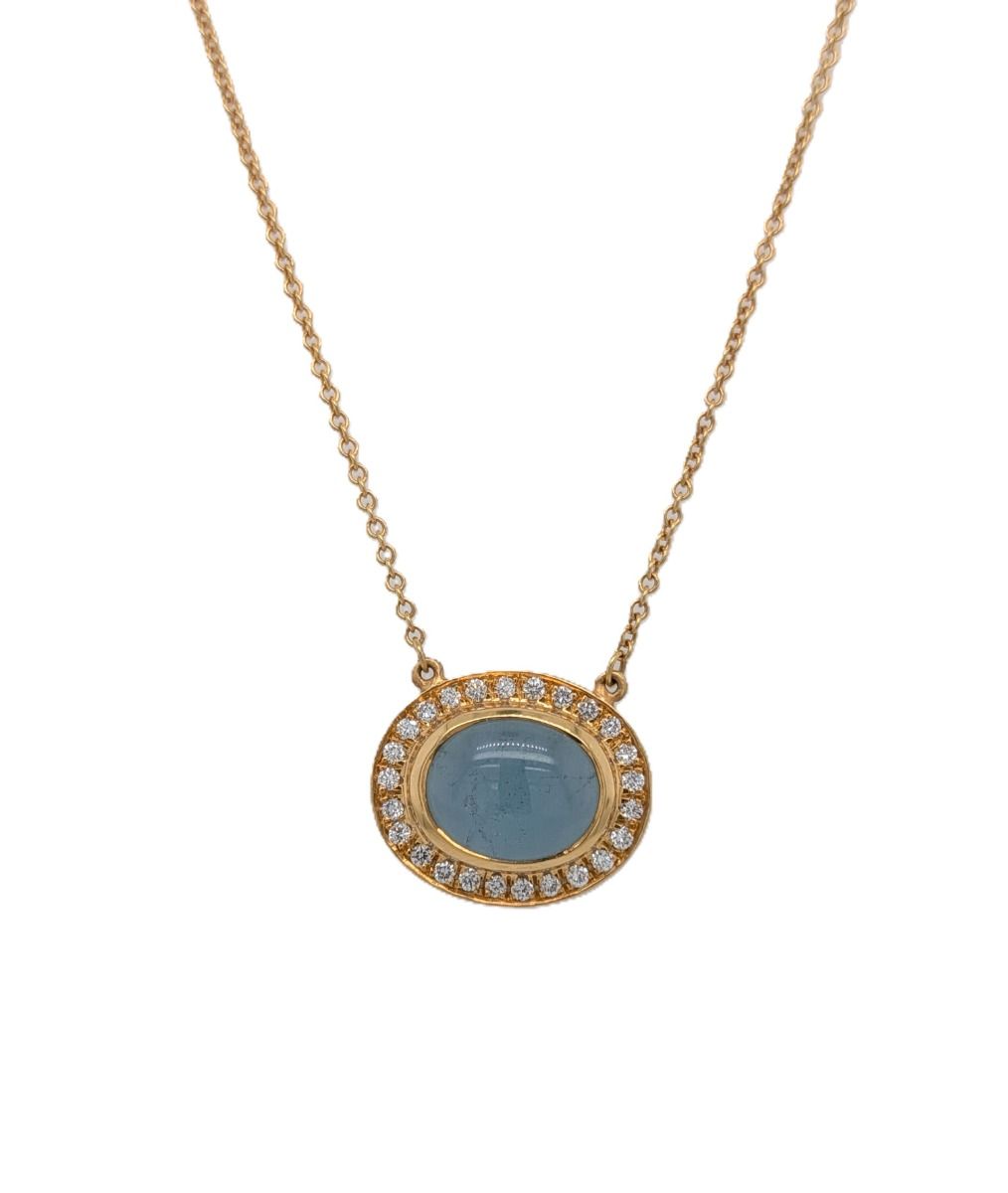 14K yellow gold necklace featuring an oval milky aquamarine center and round diamonds totaling 0.25ctw of diamonds.