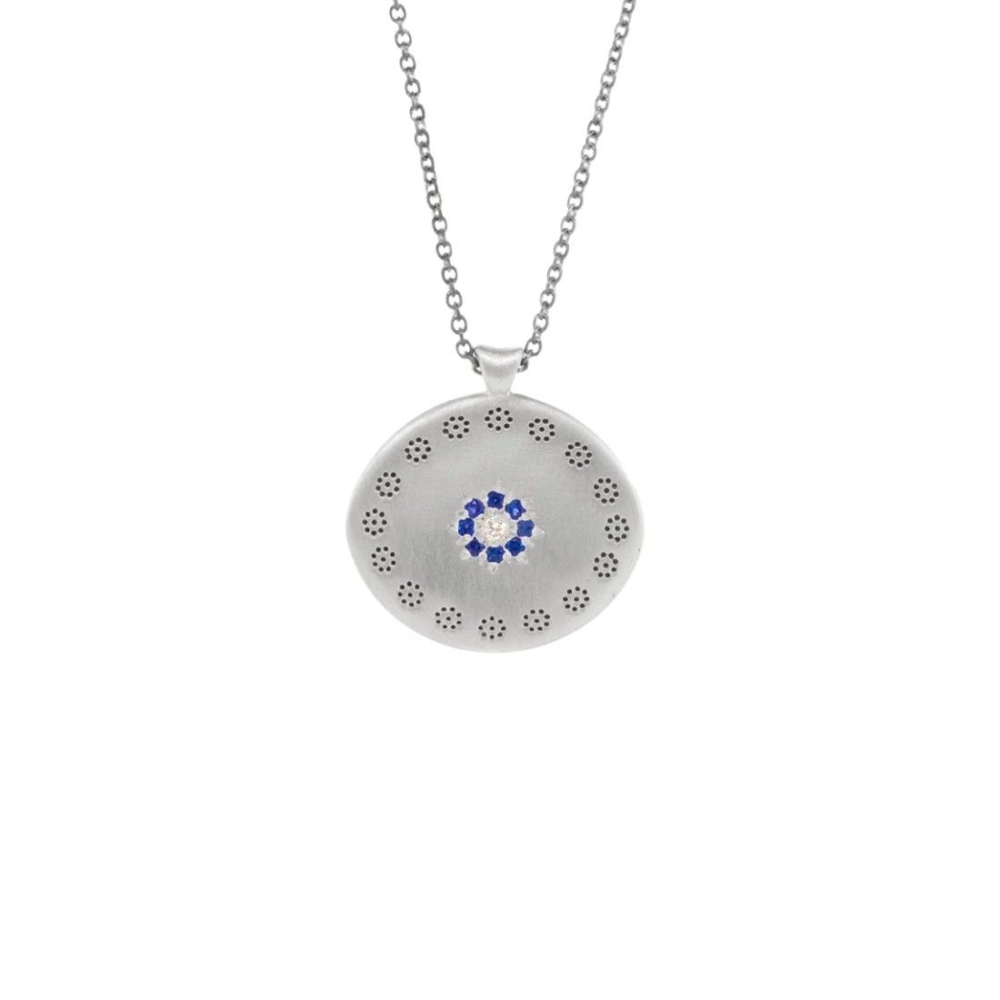 Sterling silver large cluster pendant featuring blue sapphires and diamonds.
