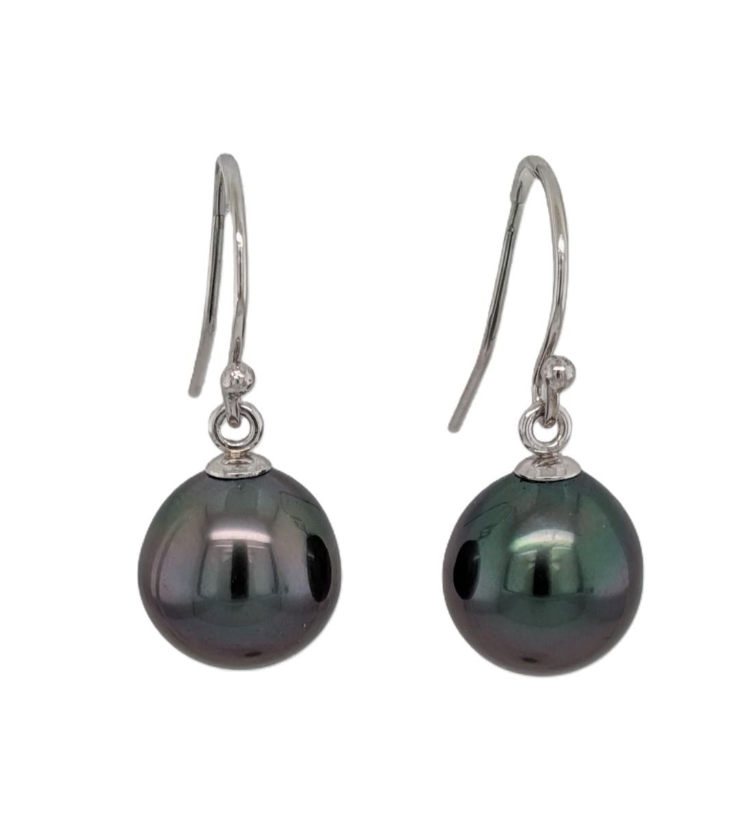 14K white gold earrings featuring Tahitian cultured pearls measuring 9-10mm.